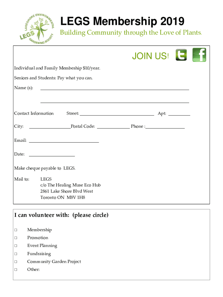 LEGS Membership 2019 Building Community through the Love of Plants. JOIN US! Individual and Family Membership $10/year. Seniors and Students: Pay what you can. Name (s): Contact Information City:Street: