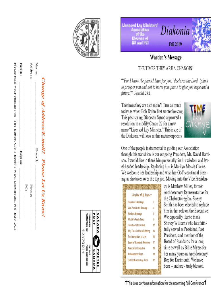 Licensed Lay Ministers Association of the Diocese of NS and PEIDiakonia Fall 2019Wardens Message Name:Change of Address/Email? Please Let Us Know! For I know the plans I have for you, declares the
