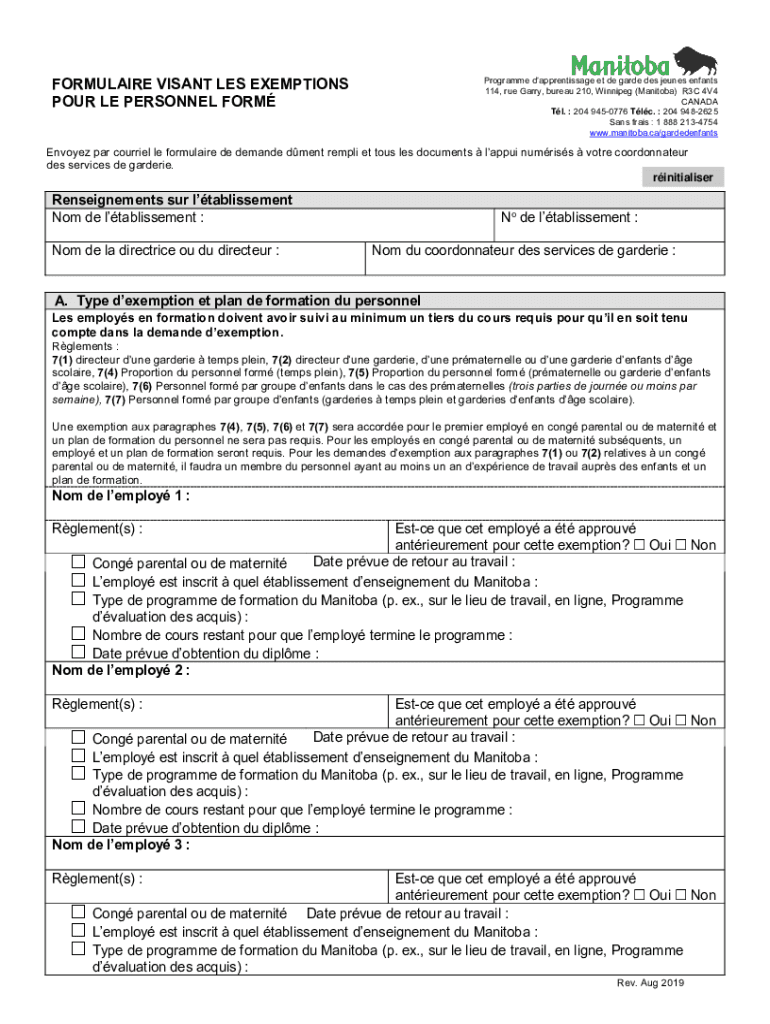 FORMULA IRE VISA NT LES EXEMPTIONS POUR LE PERSONNEL FORMProgramme dapprentissage et de garden DES Junes infants 114, rue Garry, bureau 210, Winnipeg (Manitoba) R3C 4V4 CANADA Tl. 204 9450776 TLC.