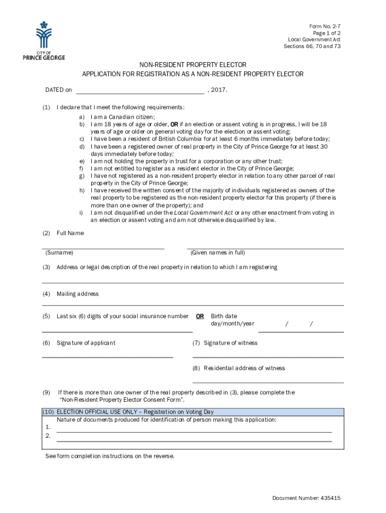 Form No. 27-Page 1 of 2 Local Government Act Sections 66, 70 and 73NONRESIDENT PROPERTY ELECTOR APPLICATION FOR REGISTRATION AS A NONRESIDENT PROPERTY ELECTOR DATED on (1), 2017. I declare that I
