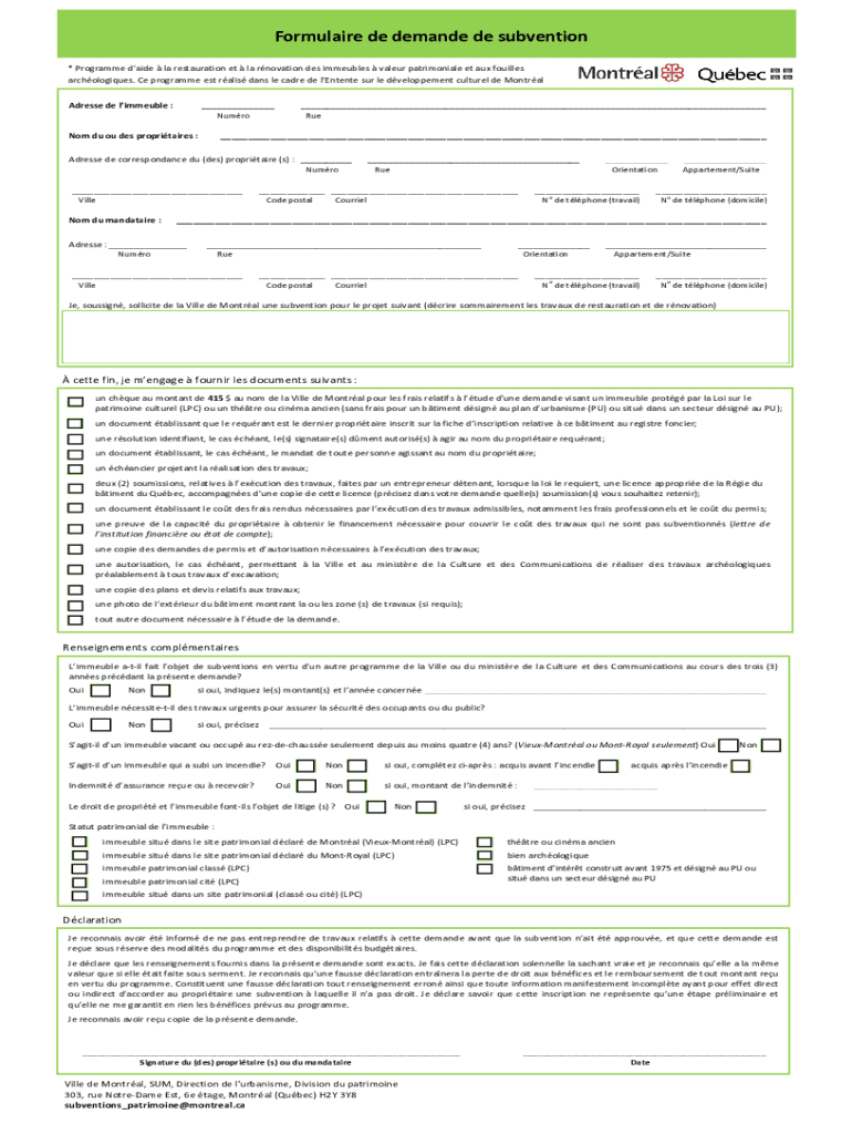 Formulairededemandedesubvention *Programmedaidelarestaurationetlarnovationdesimmeublesvaleurpatrimonialeetauxfouilles archeologies. CeprogrammeestralisdanslecadredelEntentesurledveloppementcultureldeMontral