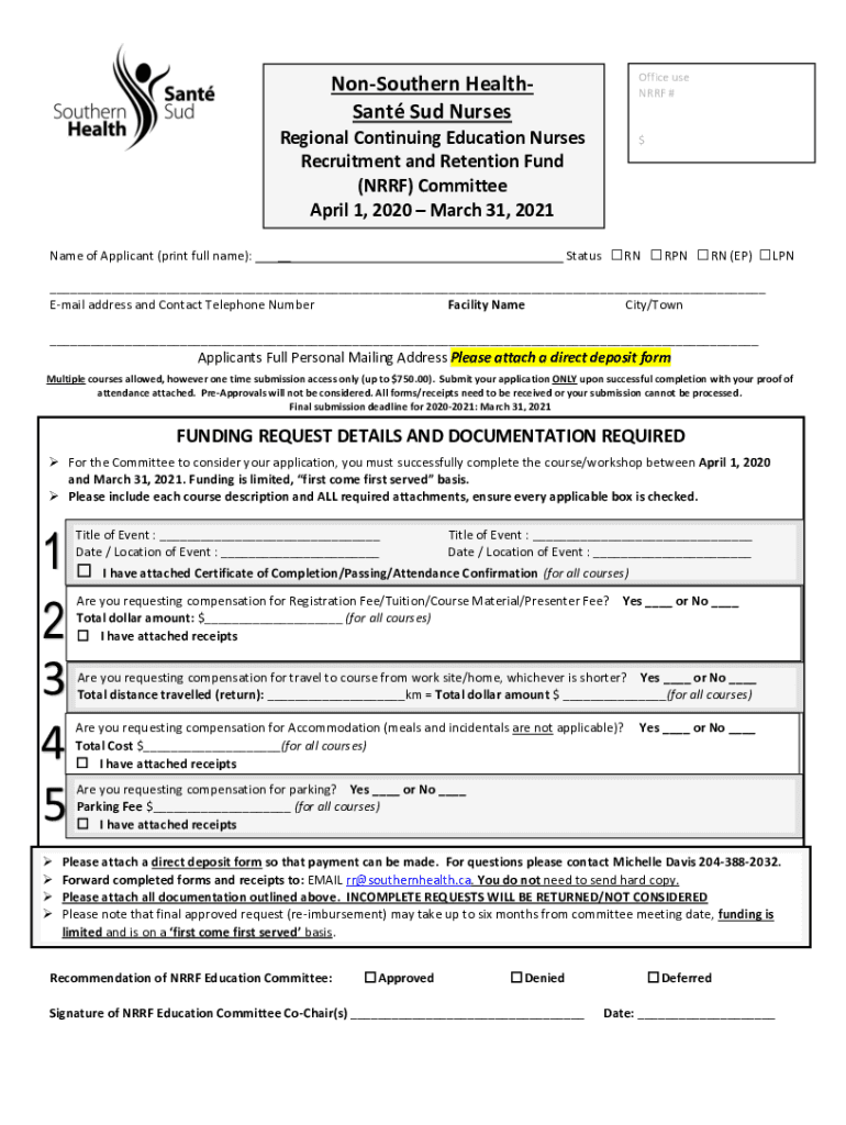 Office use NERF #Southern Healthcare SUD Nurses Regional Continuing Education Nurses Recruitment and Retention Fund (NERF) Committee April 1, 2020, March 31, 2021, Name of Applicant (print full name):status
