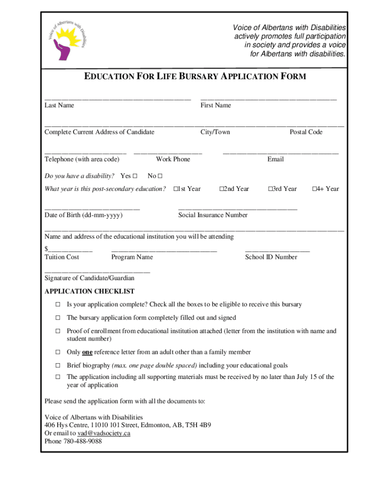Voice of Albertans with Disabilities actively promotes full participation in society and provides a voice for Albertans with disabilities. EDUCATION FOR LIFE BURSARY APPLICATION FORM Last Name First
