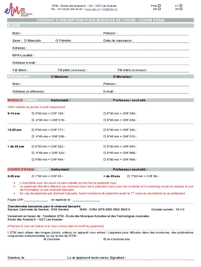 Profs o DD OEM Route DES Acacias 8 CH 1227 Les Acacias Tl : +41 (0) 22 344 44 22 / www.etm.ch / info@etm.chLV o VP contract INSCRIPTION POUR MODULES DEC OURS ESSAY ELEVEN Not :Prom :See : O Masculine