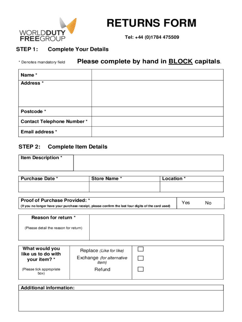 RETURNS FORM Tel: +44 (0)1784 475509STEP 1:Complete Your Details* Denotes mandatory fieldPlease complete by hand in BLOCK capitals. Name * Address *Postcode * Contact Telephone Number * Email address