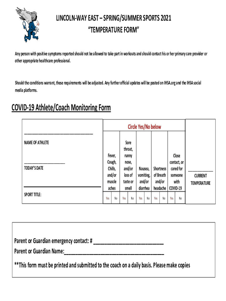 LINCOLN EAST SPRING/SUMMER SPORTS 2021 TEMPERATURE FORM Any person with positive symptoms reported should not be allowed to take part in workouts and should contact his or her primary care provider