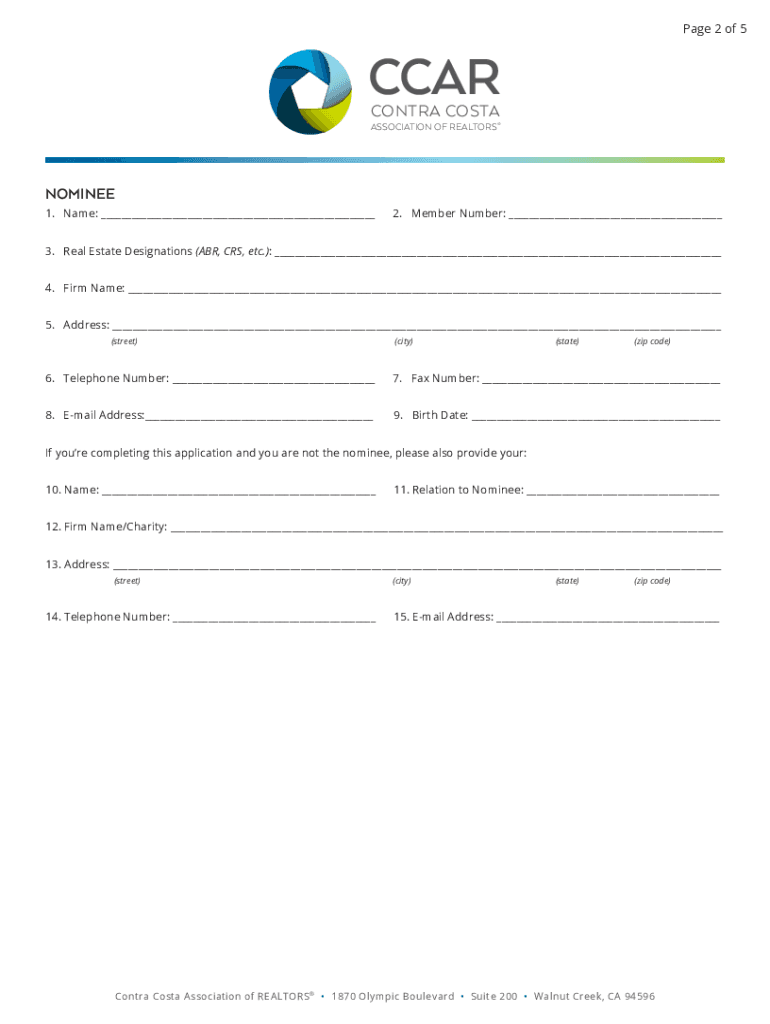 Page 1 of 5CCAR CONTRA COSTAASSOCIATION OF REALTORS2019 COMMUNITY SERVICE APPLICATION APPLICATIONS ARE DUE BY NOVEMBER 6, 2020 *You must be a Primary CAR REALTOR Member to submit a nomination. The