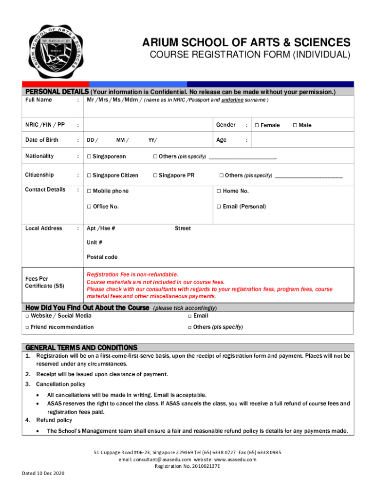 ATRIUM SCHOOL OF ARTS & SCIENCES COURSE REGISTRATION FORM (INDIVIDUAL)PERSONAL DETAILS (Your information is Confidential. No release can be made without your permission.) Full Name:ERIC /FIN / PP:Date