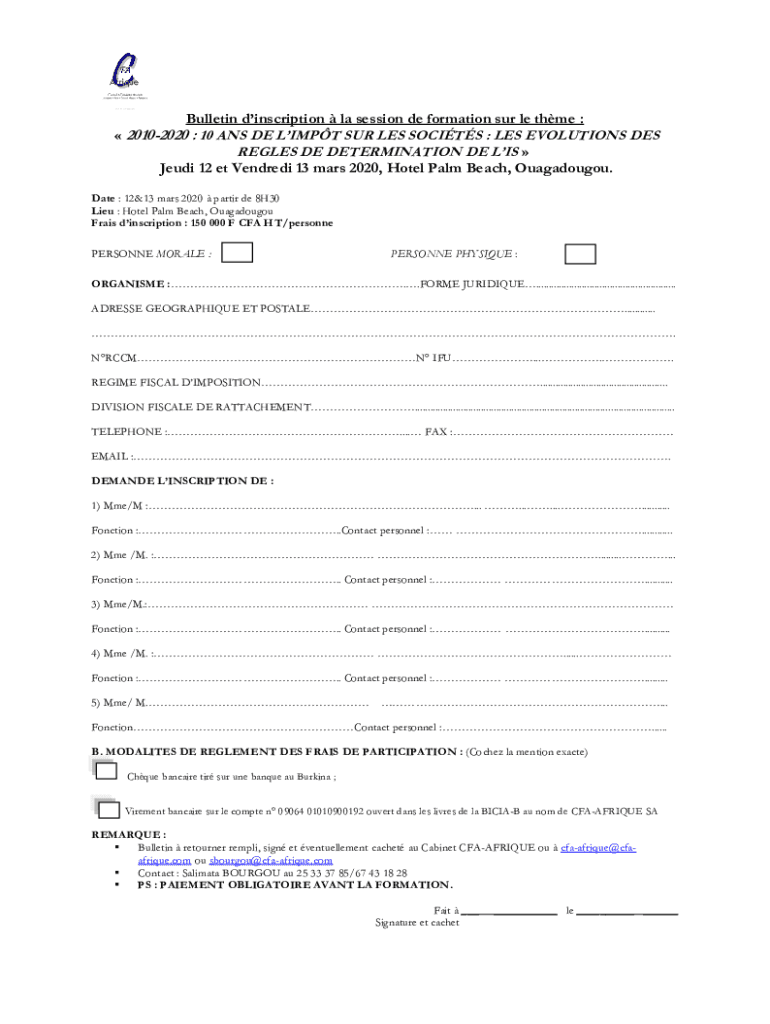 Bulletin inscription la session DE formation SUR LE the : 20102020 : 10 ANS DE LIMIT SUR LES SOC ITS : LES EVOLUTIONS DES REGALES DE DETERMINATION DE IS Jedi 12 ET Vended 13 Mars 2020, Hotel Palm
