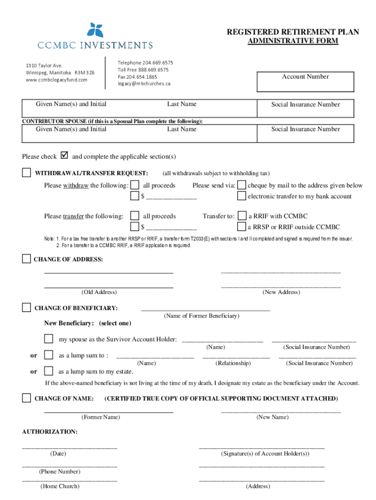 REGISTERED RETIREMENT PLAN ADMINISTRATIVE FORM Telephone 204.669.6575 Toll Free 888.669.6575 Fax 204.654.1865 legacy@mbchurches.ca1310 Taylor Ave. Winnipeg, Manitoba R3M 3Z6 www.ccmbclegacyfund.comGiven