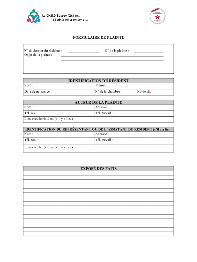 Le CHILD Bussed (QC) inc. L o la vie a UN sens. FORMULA IRE DE PLAINT No Du dossier Du resident : Object DE la plaint :No de la plaint :IDENTIFICATION DU RESIDENT Not :Prom :Date de Renaissance :No