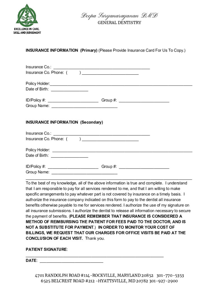 Deep Suryanarayanan DMD GENERAL DENTISTRY INSURANCE INFORMATION (Primary) (Please Provide Insurance Card For Us To Copy.) Insurance Co.: Insurance Co. Phone: () policyholder: Date of Birth: ID/Policy