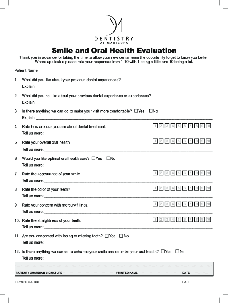 Smile and Oral Health Evaluation Thank you in advance for taking the time to allow your new dental team the opportunity to get to know you better. Where applicable please rate your responses from