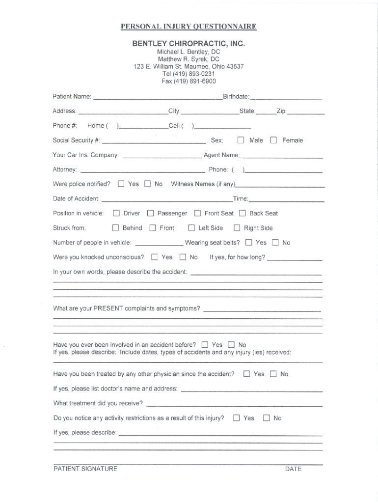 PERSONAL INJURY QUESTIONNAIREBENTLEY CHIROPRACTIC, INC. Michael L. Bentley, DC Matthew R. Shrek, DC 123 E. William St. Maumee, Ohio 43537 Tel (419) 8930231 Fax (419) 8916900 Patient Name: Address: