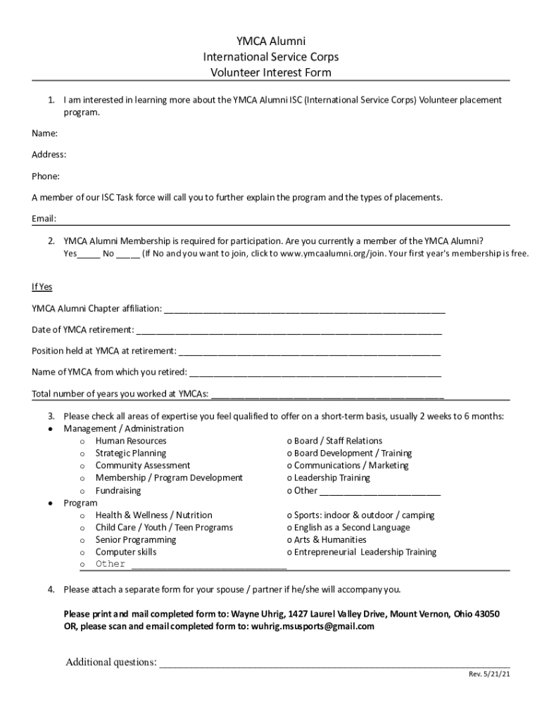 YMCA Alumni International Service Corps Volunteer Interest Form 1. I am interested in learning more about the YMCA Alumni ISC (International Service Corps) Volunteer placement program. Name: Address: