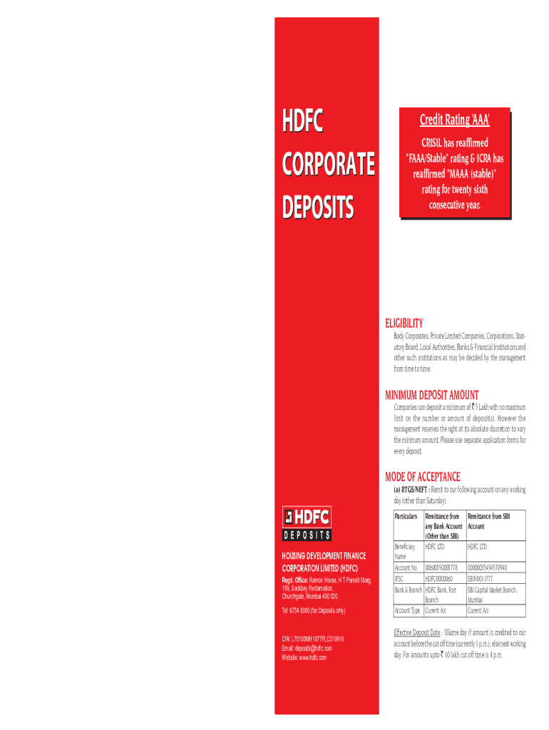 OFFICES: HOUSING DEVELOPMENT FINANCE CORPORATION LIMITED Registered Office : Ramon House, H T Parekh Mary, 169, Back bay Reclamation, Churchgate, Mumbai 400 020. Tel: 66316060, 22820282. Fax: 22821366,