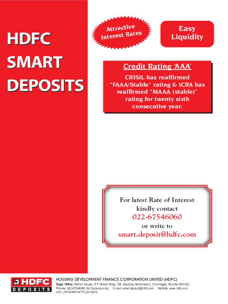 HDFC SMART DEPOSITSAttractive dates Interest Easy LiquidityCredit Rating AAA CRISIS has reaffirmed AAA/Stable rating & ICRA has reaffirmed MAYA (stable) rating for twenty-sixth consecutive year. For