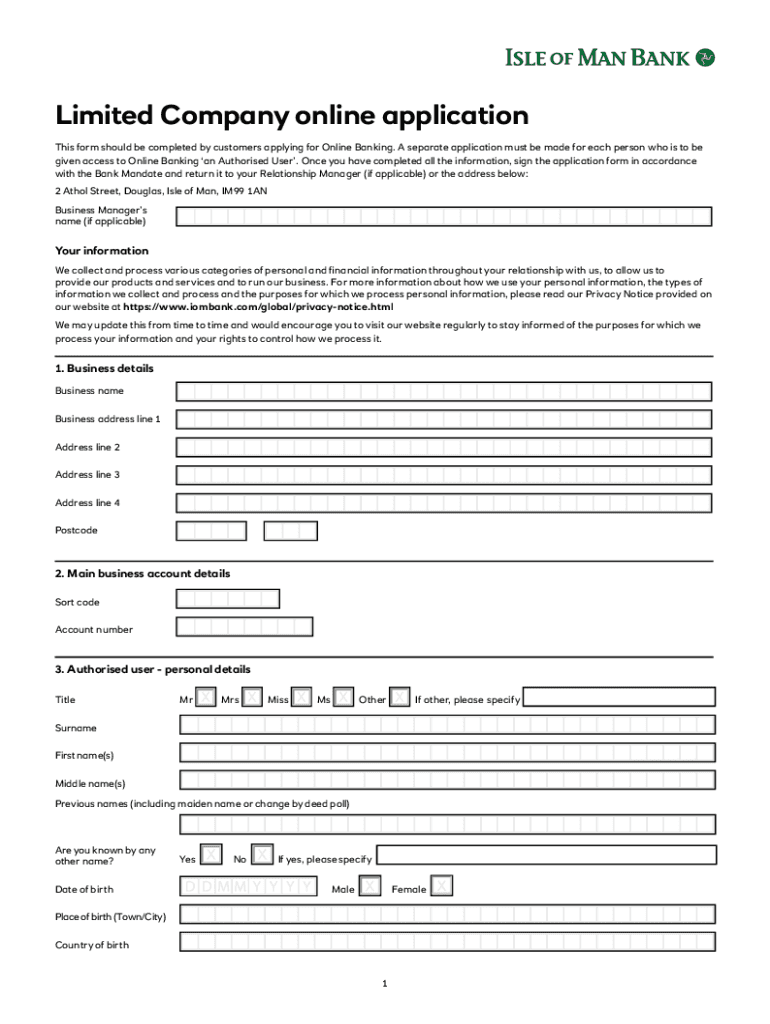 Limited Company online application This form should be completed by customers applying for Online Banking. A separate application must be made for each person who is to be given access to Online Banking