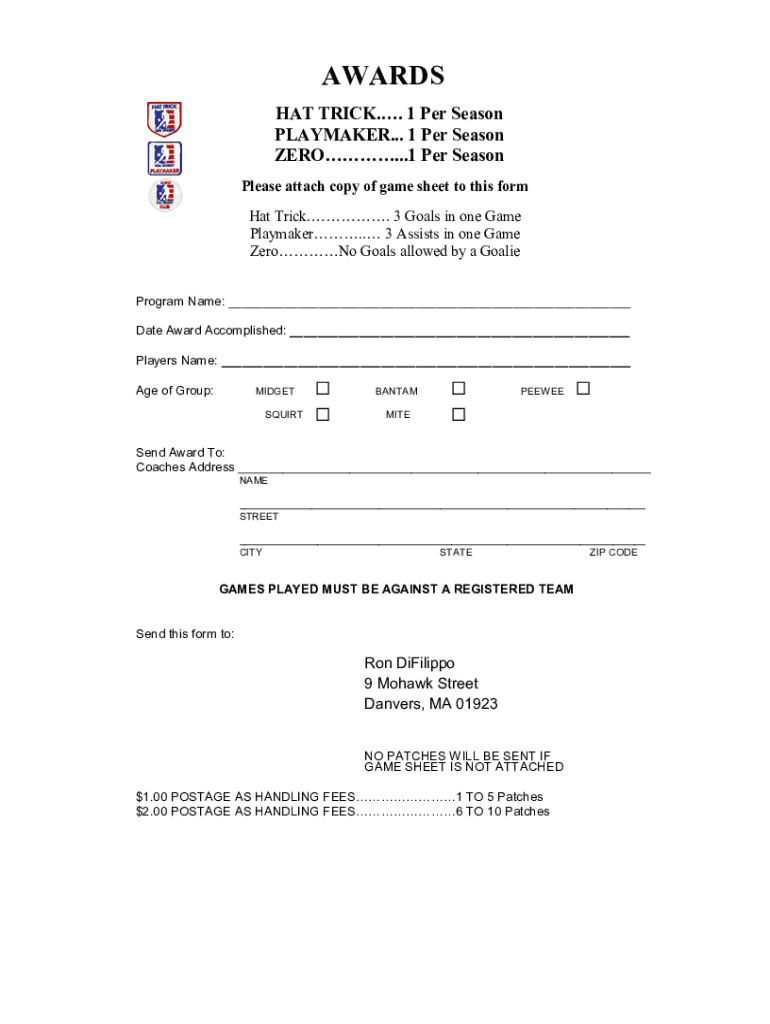 AWARDS HAT TRICK. 1 Per Season PLAYMAKER... 1 Per Season ZERO...1 Per Season Please attach copy of game sheet to this form Hat Trick. 3 Goals in one Game Playmaker. 3 Assists in one Game Zero No Goals