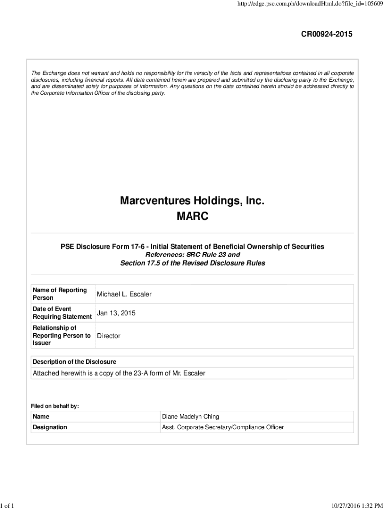 Get the free 01-23-2015 Form 17-6 - Initial Statement of Beneficial Ownership of SecuritiesEscaler