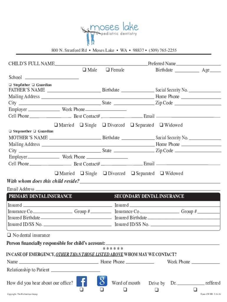 800 N. Stratford Rd Moses Lake WA 98837 (509) 7652255CHILDS FULL NAMESchoolPreferred Name Birthdate Male Female Stepfather GuardianFATHERS NAMEBirthdateMailing AddressCityStateEmployerWork Phone Cell