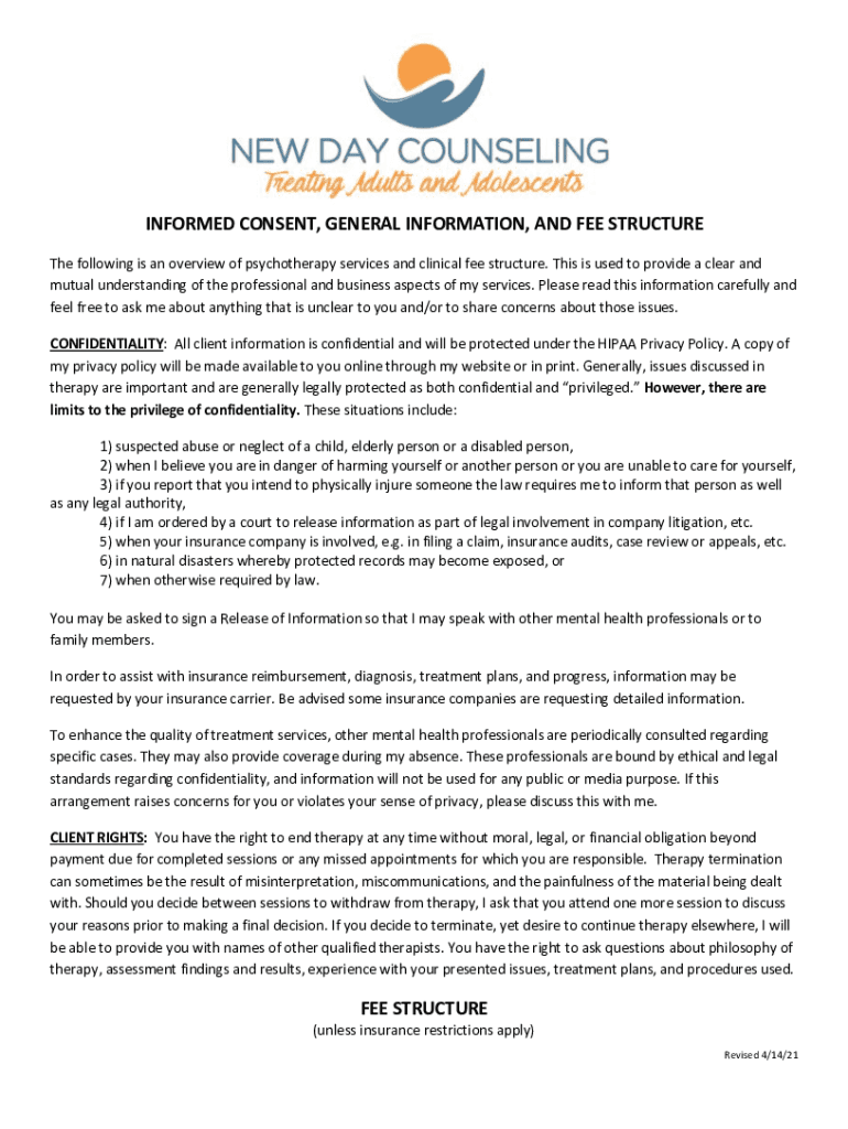 INFORMED CONSENT, GENERAL INFORMATION, AND FEE STRUCTURE The following is an overview of psychotherapy services and clinical fee structure. This is used to provide a clear and mutual understanding