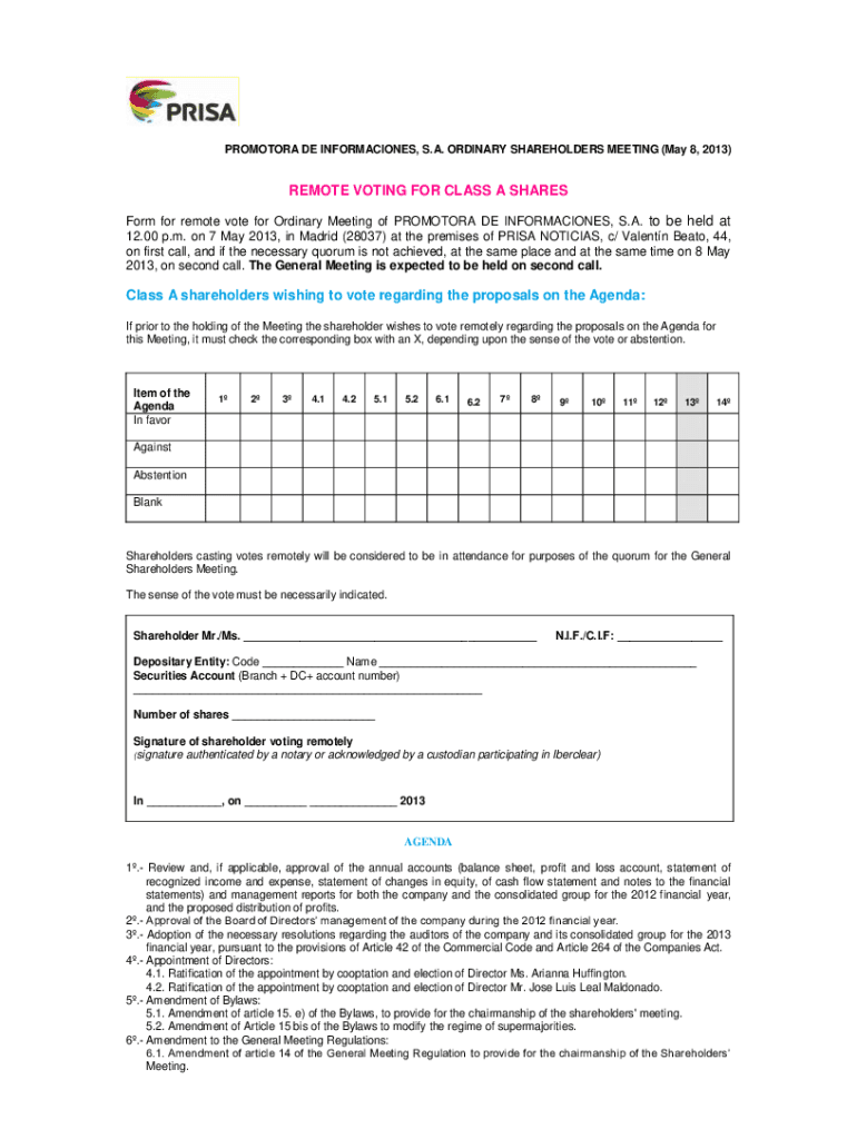 PROMOTER DE INFORMATION, S.A. ORDINARY SHAREHOLDERS MEETING (May 8, 2013)REMOTE VOTING FOR CLASS A SHARES Form for remote vote for Ordinary Meeting of PROMOTER DE INFORMATION, S.A. to be held at 12.00