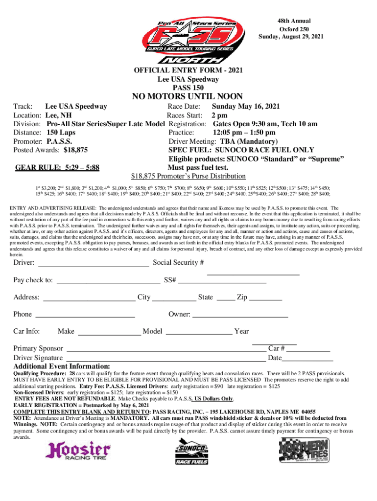 48th Annual Oxford 250 Sunday, August 29, 2021OFFICIAL ENTRY FORM 2021 Lee USA Speedway PASS 150NO MOTORS UNTIL NOON Track: Lee USA Speedway Race Date: Sunday, May 16, 2021, Location: Lee, NH Races