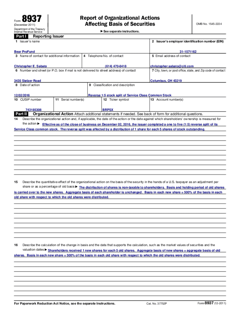 8937Report of Organizational Actions Affecting Basis of SecuritiesForm (December 2011) Department of the Treasury Internal Revenue Serviceman I See OMB No. 15452224separate instructions. Reporting
