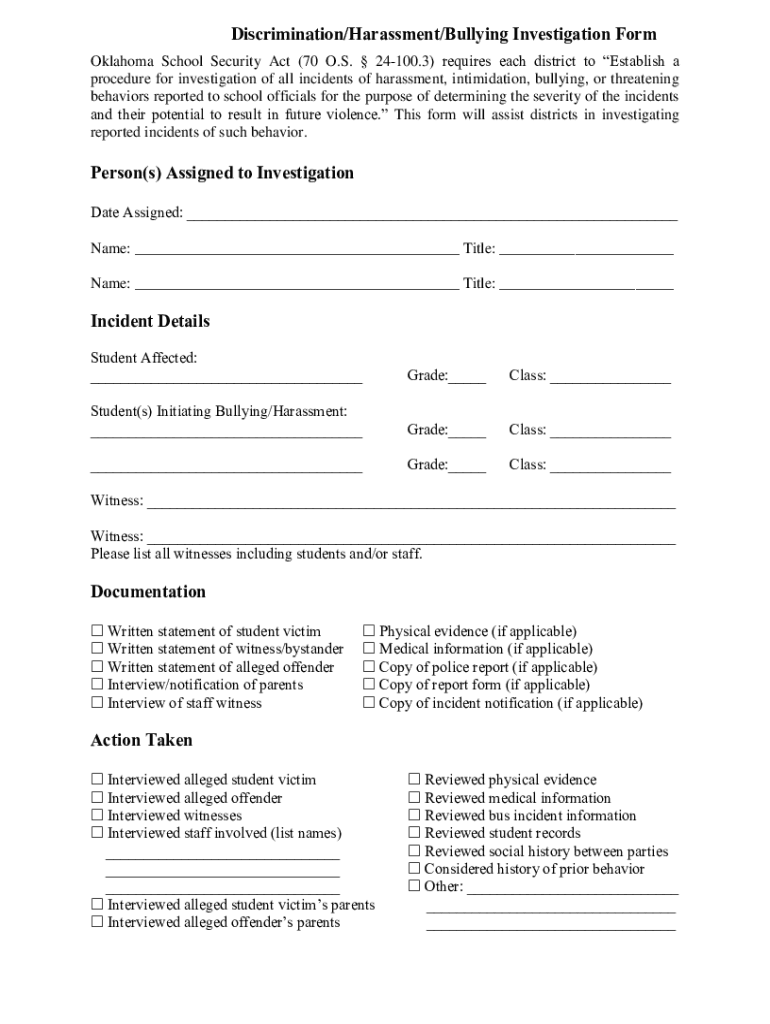 Discrimination/Harassment/Bullying Investigation Form Oklahoma School Security Act (70 O.S. 24100.3) requires each district to Establish a procedure for investigation of all incidents of harassment,