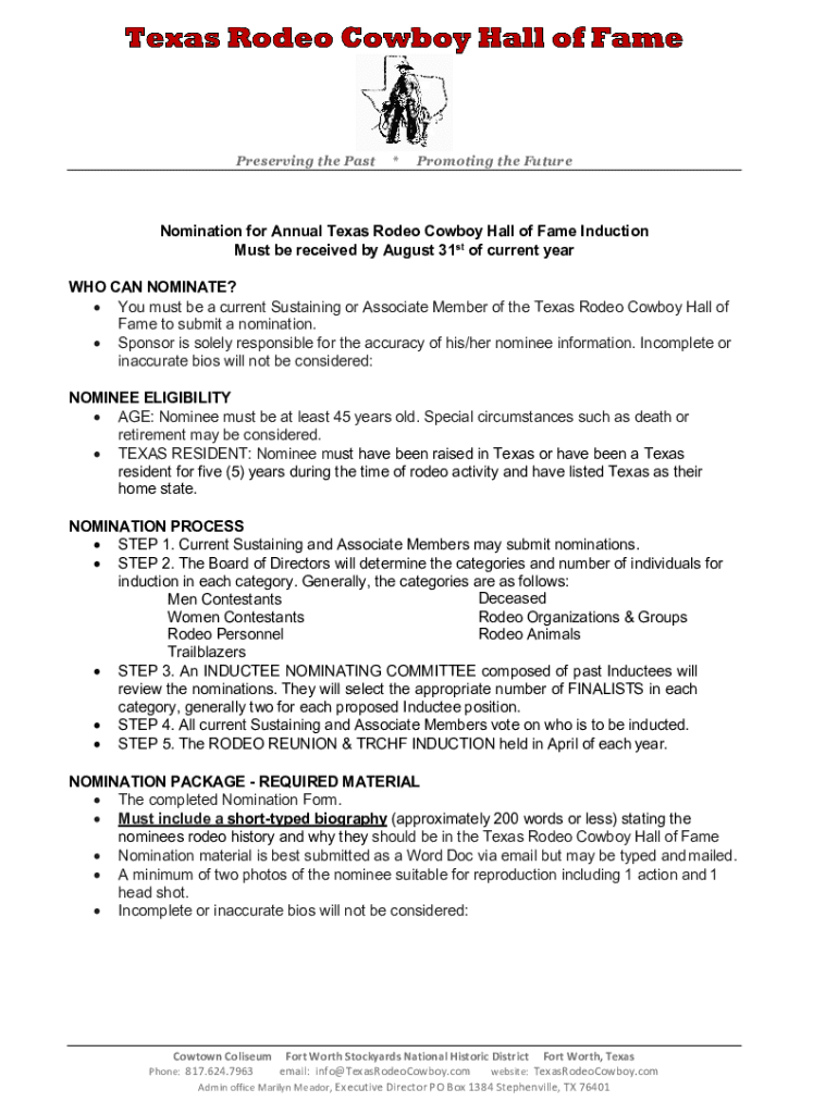 Preserving the Past×Promoting the FutureNomination for Annual Texas Rodeo Cowboy Hall of Fame Induction Must be received by August 31st of current year WHO CAN NOMINATE? You must be a current Sustaining