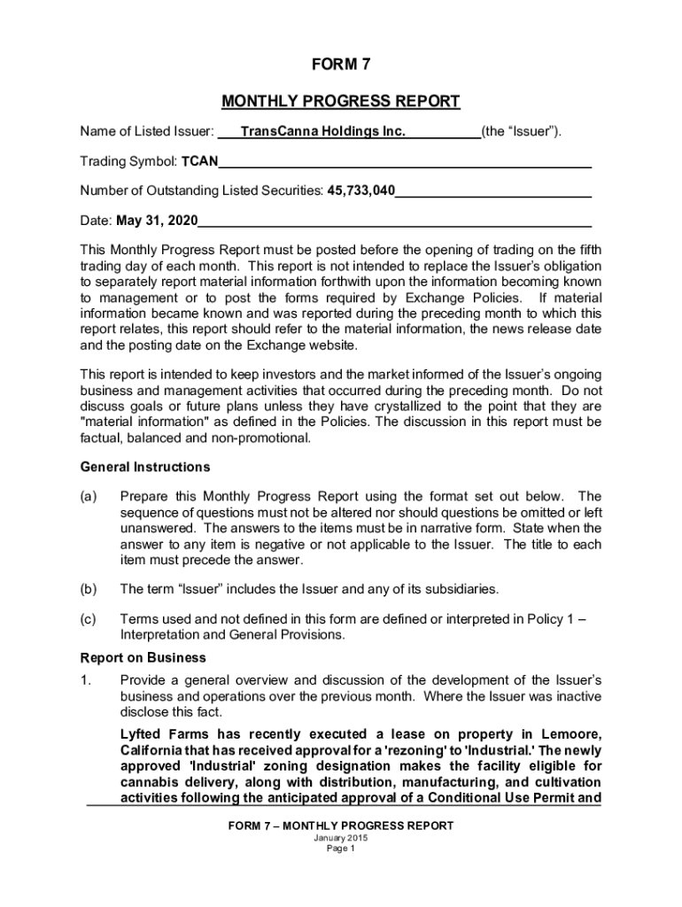 FORM 7 MONTHLY PROGRESS REPORT Name of Listed Issuer:Transcend Holdings Inc.(the Issuer). Trading Symbol: CAN Number of Outstanding Listed Securities: 45,733,040 Date: May 31, 2020, This Monthly Progress