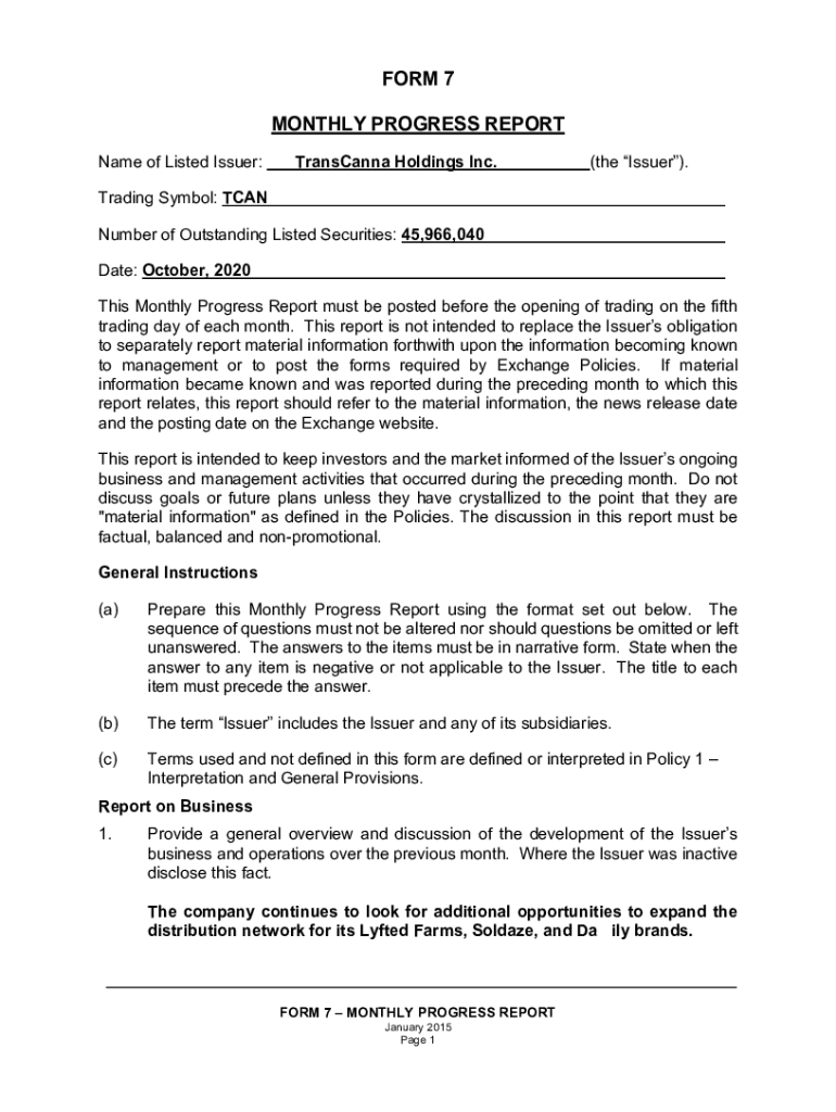 FORM 7 MONTHLY PROGRESS REPORT Name of Listed Issuer:Transcend Holdings Inc.(the Issuer). Trading Symbol: CAN Number of Outstanding Listed Securities: 45,966,040 Date: October 2020 This Monthly Progress