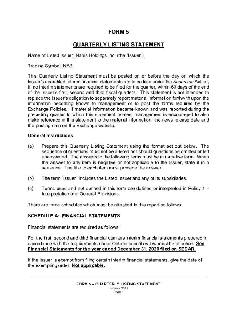 FORM 5 QUARTERLY LISTING STATEMENT Name of Listed Issuer: Nazis Holdings Inc. (the Issuer). Trading Symbol: NAB This Quarterly Listing Statement must be posted on or before the day on which the Issuers
