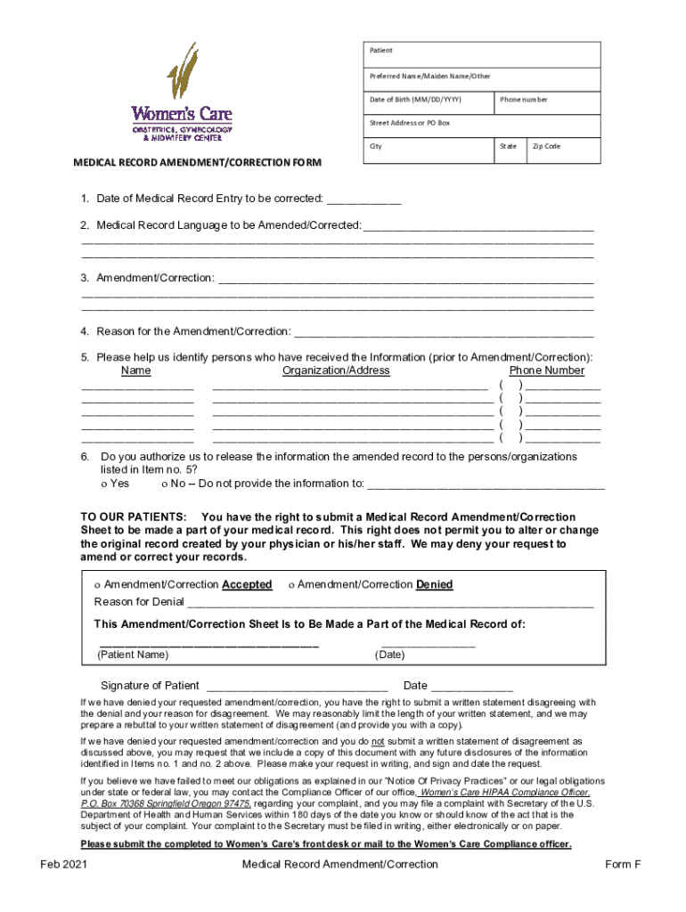 Patient PreferredName/Maidenhair/Other DateofBirth(MM/DD/YYY) Phone number StreetAddressorPOBox MEDICALRECORDAMENDMENT/CORRECTIONFORMCityStateZipCode 1. Date of Medical Record Entry to be corrected: