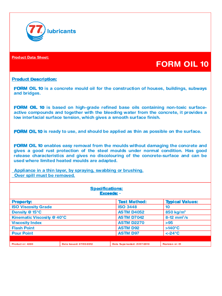 Product Data Sheet:FORM OIL 10 Product Description: FORM OIL 10 is a concrete mold oil for the construction of houses, buildings, subways and bridges. FORM OIL 10 is based on high grade refined base
