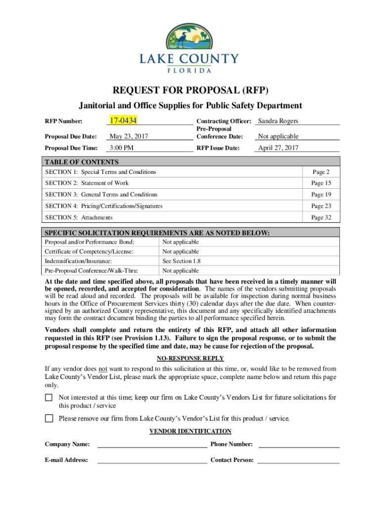 REQUEST FOR PROPOSAL (RFP) Janitorial and Office Supplies for Public Safety Department RFP Number:170434Proposal Due Date: Proposal Due Time:Sandra Rogers May 23, 2017Contracting Officer: Proposal
