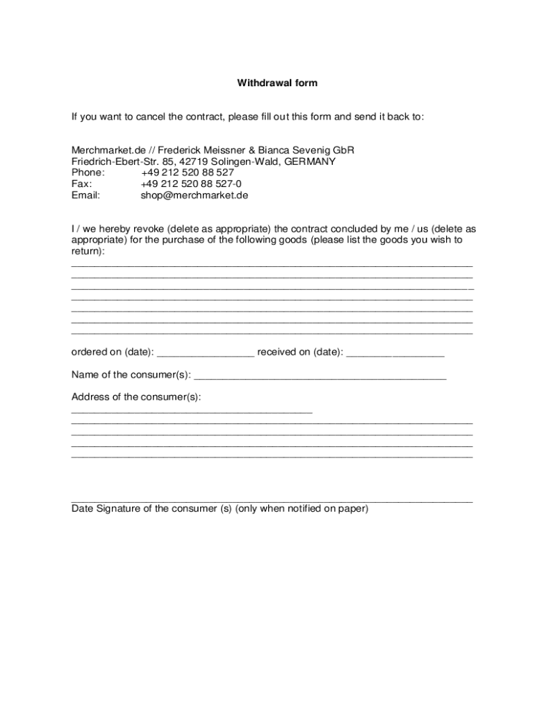 Withdrawal formic you want to cancel the contract, please fill out this form and send it back to:Benchmarked.DE // Frederick Meissner & Bianca Seven GBR FriedrichEbertStr. 85, 42719 SolingenWald,