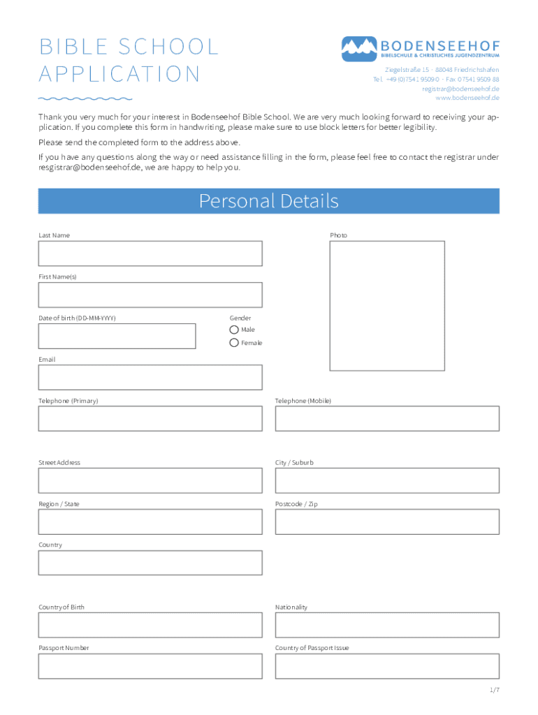 Bi bl e School Apply i c ationZiegelstrae 15 88048 Friedrichshafen Tel. +49 (0)7541 9509 0 Fax 07541 9509 88 registrar@bodenseehof.de www.bodenseehof.deThank you very much for your interest in Bodensee