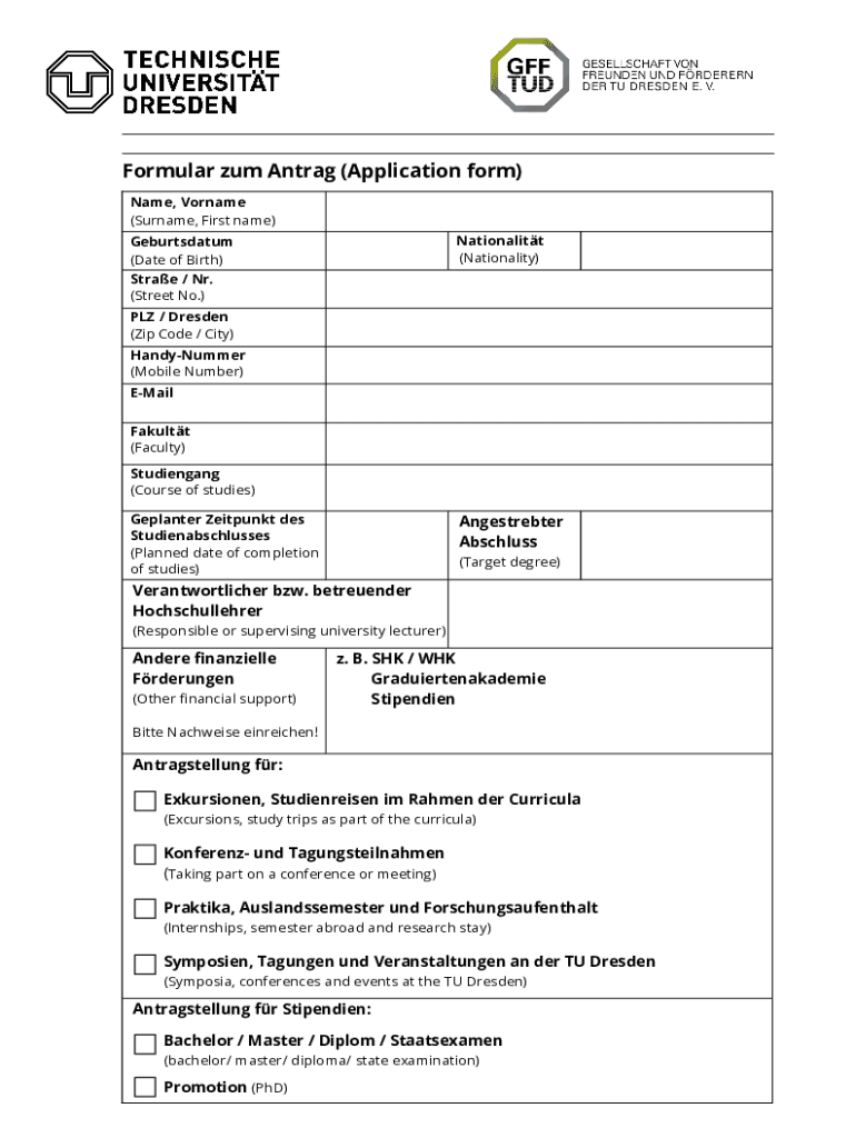 Formula sum Ant rag (Application form) Name, Surname (Surname, First name) Nationalist (Nationality)Geburtsdatum (Date of Birth) Straw / NR. (Street No.) PLY / Dresden (Zip Code / City) HandyNummer
