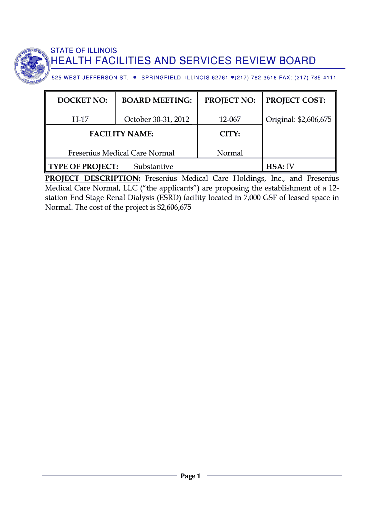 STATE OF ILLINOIS HEALTH FACILITIES AND SERVICES REVIEW BOARD 52525 WEST JEFFERSON ST. SPRINGFIELD, ILLINOIS 62761 (217) 7823516 FAX: (217) 7854111 DOCKET NO: BOARD MEETING: PROJECT NO: H17 October
