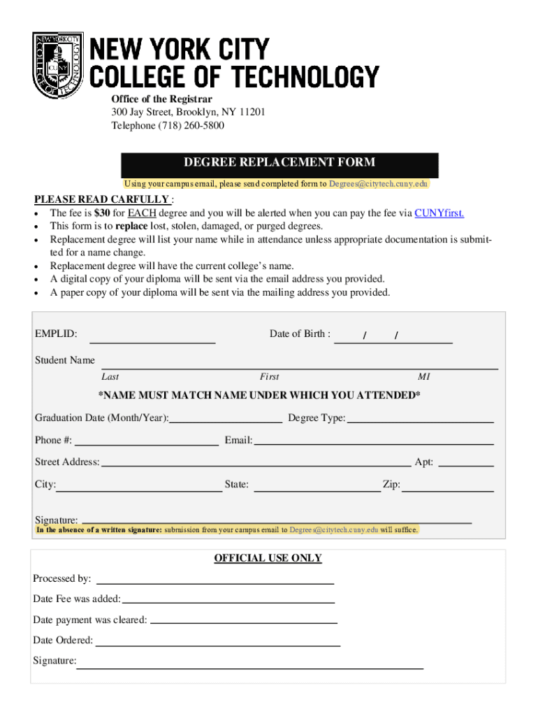 Office of the Registrar 300 Jay Street, Brooklyn, NY 11201 Telephone (718) 2605800DEGREE REPLACEMENT FORM Using your campus email, please send completed form to Degrees@citytech.cuny.eduPLEASE READ