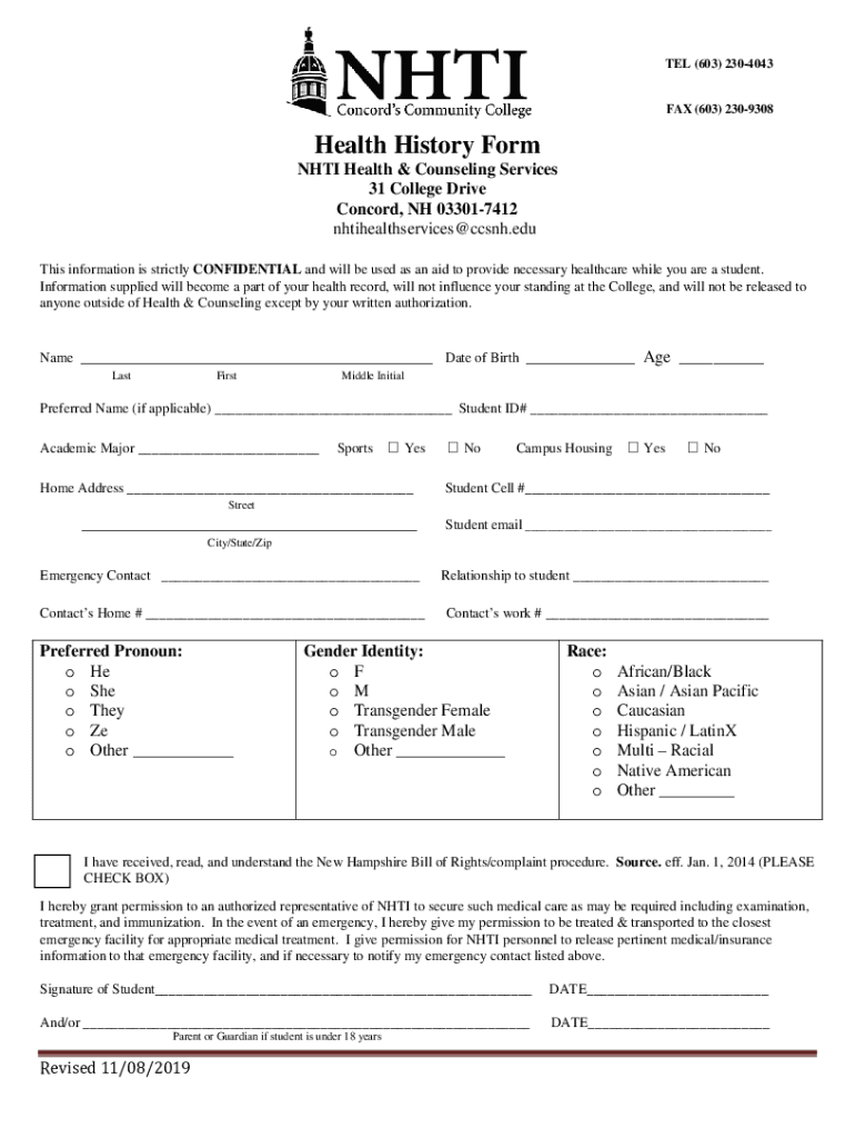 TEL (603) 2304043FAX (603) 2309308Health History Form NH TI Health & Counseling Services 31 College Drive Concord, NH 033017412 nhtihealthservices cash.edu This information is strictly CONFIDENTIAL