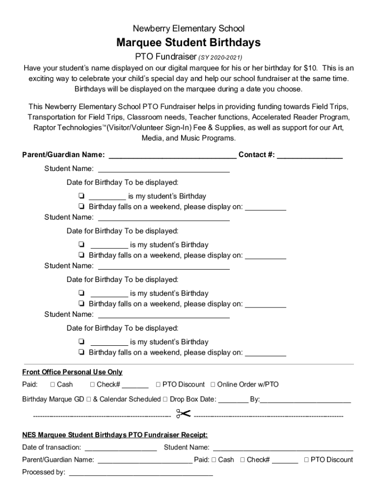 Newberry Elementary SchoolMarquee Student Birthdays PTO Fundraiser (SY 20202021) Have your students name displayed on our digital marquee for his or her birthday for $10. This is an exciting way to