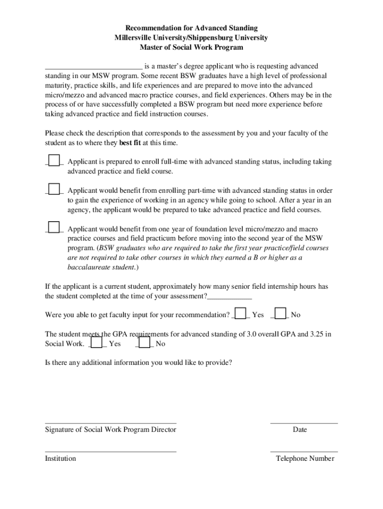 Recommendation for Advanced Standing Minersville University/Shippensburg University Master of Social Work Program is a master’s degree applicant who is requesting advanced standing in our MSW program.