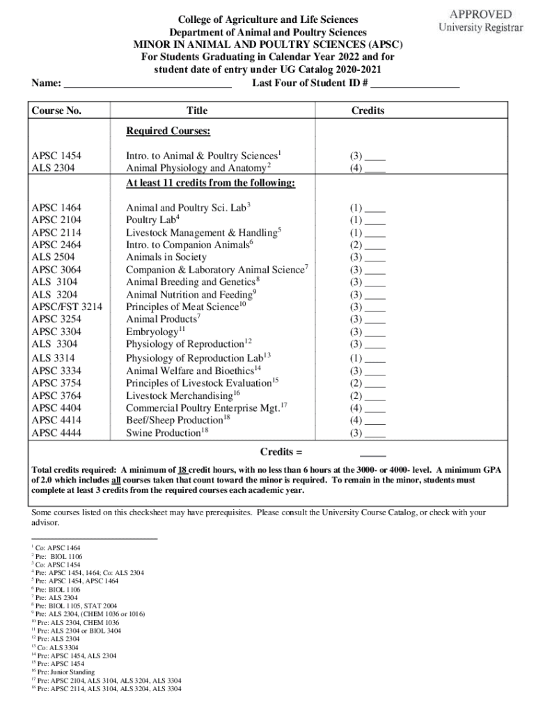 College of Agriculture and Life Sciences Department of Animal and Poultry Sciences MINOR IN ANIMAL AND POULTRY SCIENCES (APC) For Students Graduating in Calendar Year 2022 and for student date of