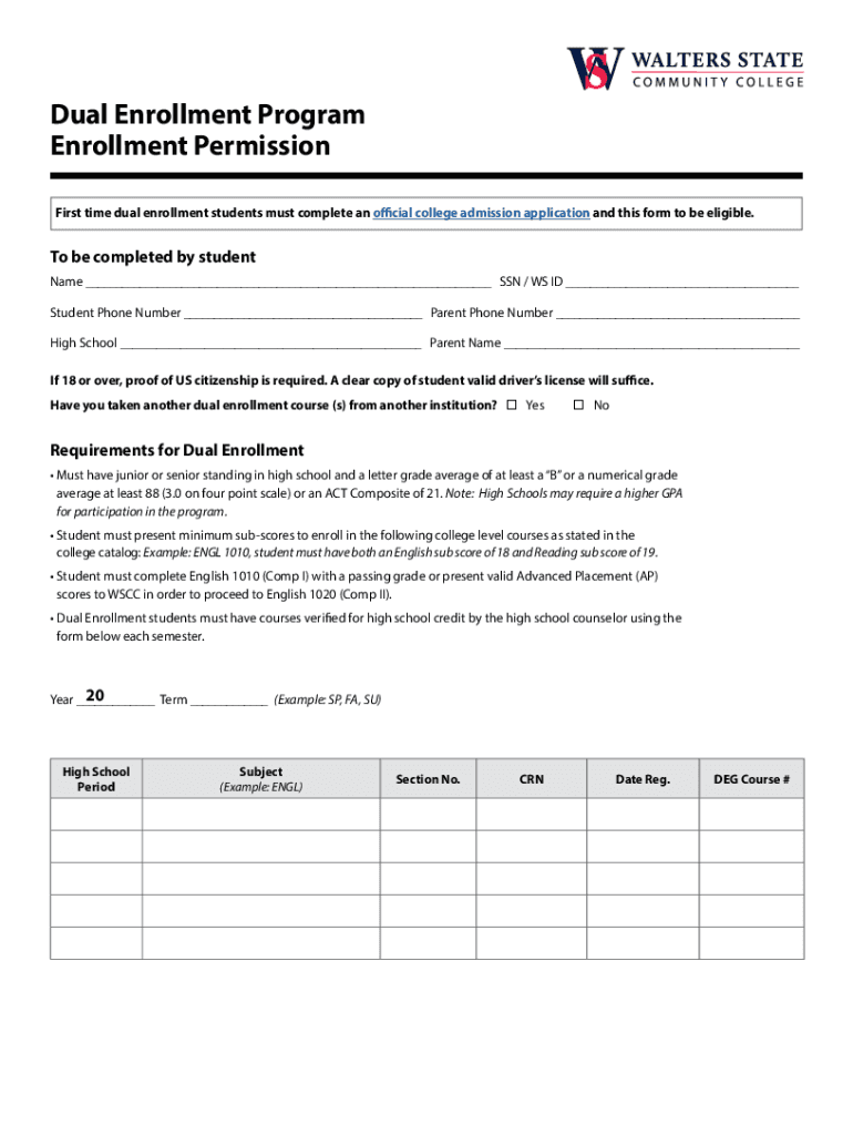 Dual Enrollment Program Enrollment Permission First time dual enrollment students must complete an official college admission application and this form to be eligible. To be completed by student Name