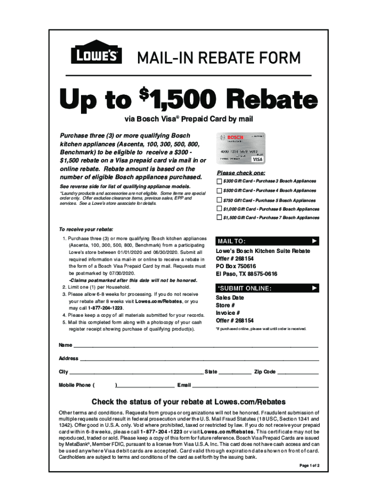 Up to 1,500 Rebate via Bosch Visa Prepaid Card by mailPurchase three (3) or more qualifying Bosch kitchen appliances (Ascent, 100, 300, 500, 800, Benchmark) to be eligible to receive a $$3001,500