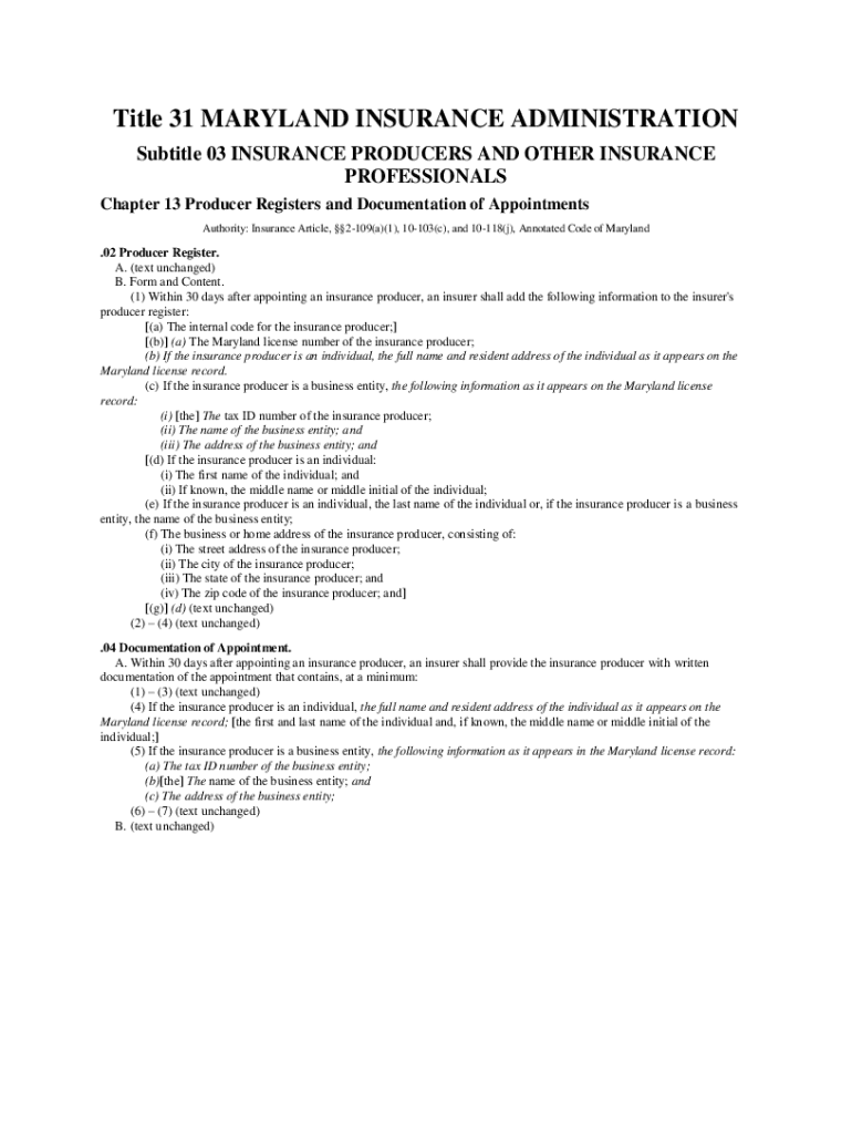 Title 31 MARYLAND INSURANCE ADMINISTRATION Subtitle 03 INSURANCE PRODUCERS AND OTHER INSURANCE PROFESSIONALS Chapter 13 Producer Registers and Documentation of Appointments Authority: Insurance Article,