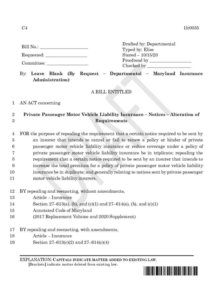 C41lr0035 Drafted by: Departmental Typed by: Elise Stored 10/15/20 Proofread by Checked by Bill No.: Requested: Committee: By:Leave Blank (By Administration)RequestDepartmentalMarylandInsuranceA BILL